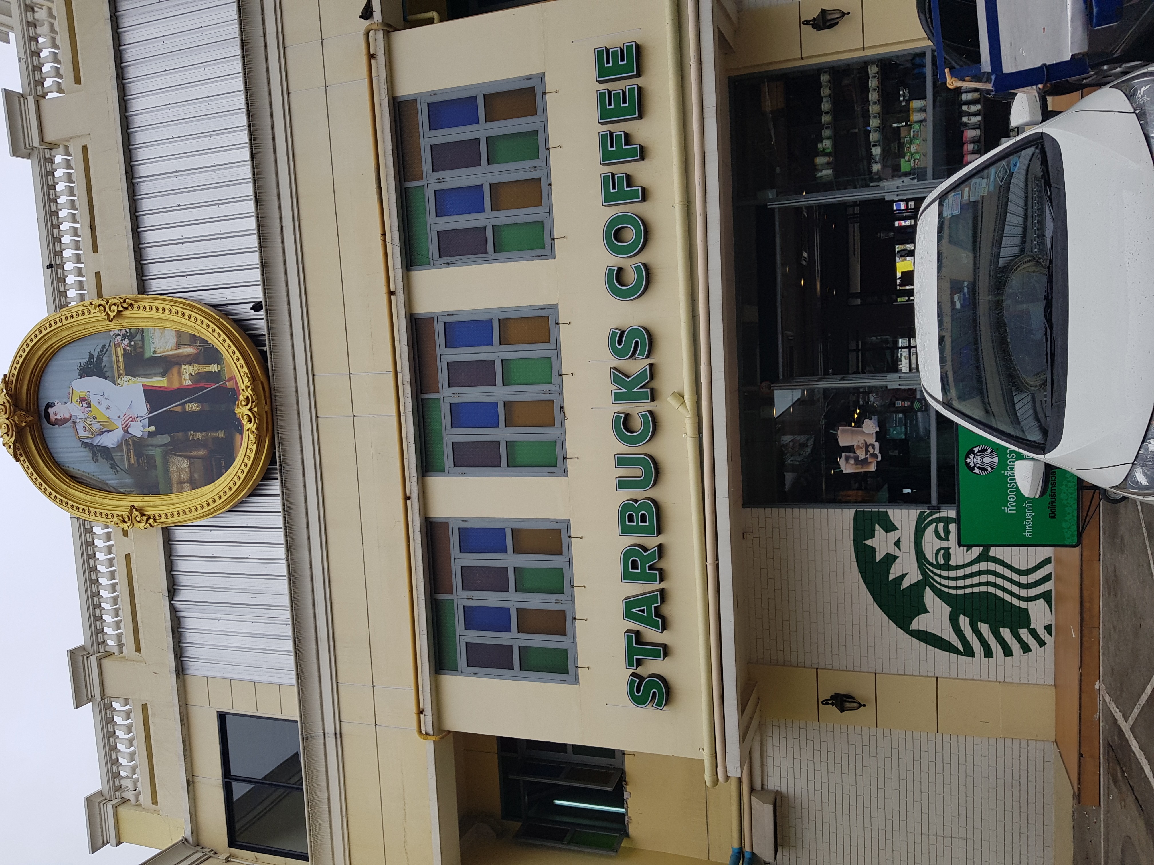 시장길을 따라 들어가다보니 뜬금없는 곳에 스타벅스가 있었다. 이보다 더 개연성 없는 전개가 어디냐 생각하는데 가만히 보니 강을 따라 꽤 큰 건물이 자리잡고 있다. 가장 몫 좋은 자리, 시장과 나란히 서 있지만 완벽하게 다른 세상을 구현하는 쇼핑몰, Yodpiman Riverwalk. 시장과 강 사이에 초현대식 쇼핑몰이라니.. 스타벅스 간판보다 더 높은 곳에 걸린 금빛 테두리의 국왕 사진이 모든 걸 설명한다. 여기가 방콕이야, 라고.