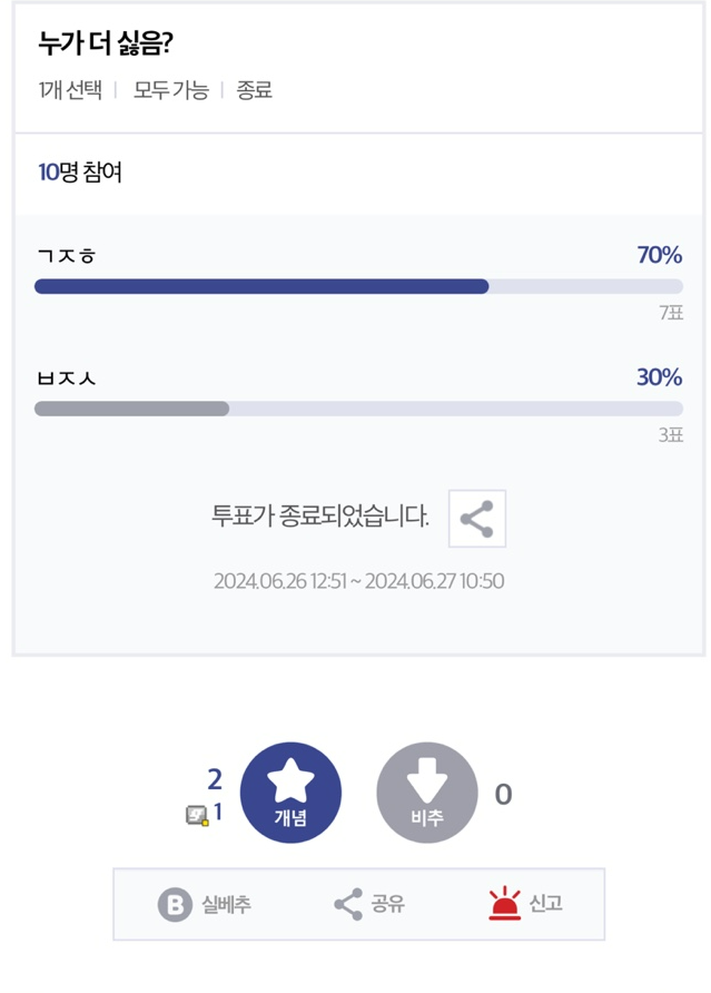 11기가 올린게 분명한 글에서 나는 누가 더 싫은지의 투표 대상이 되었고, 나를 저격한 이 글은 수많은 추천을 받아 개념글이 되어 있었다.