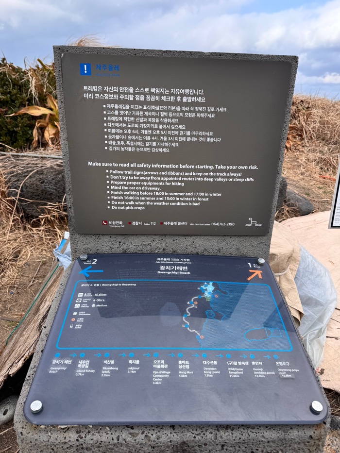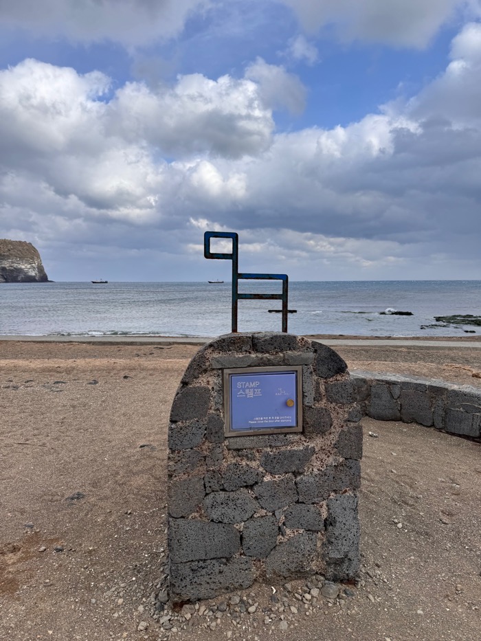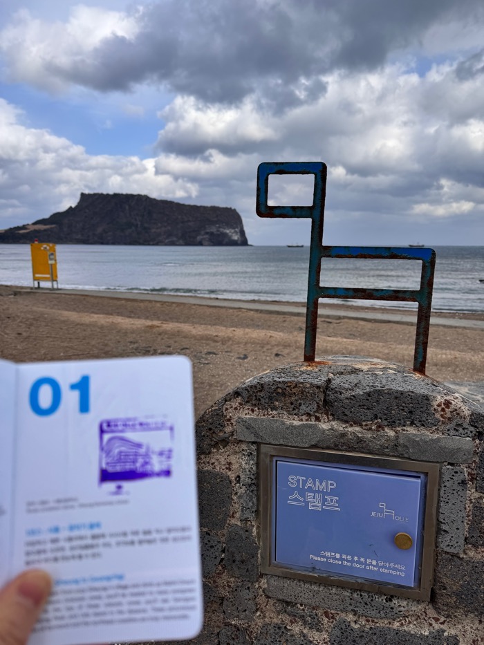 허허허허허. 올레길 코스에 시작점, 중간점, 종점의 도장이 각각 다 다른 거였다. 그러니까 내가 지나쳐 온 광치기해변에서 2번 코스 시작 도장을 찍고 왔어야 했고, 여긴 미니미니한 사이즈의 중간 도장만 가능한 지점이었다. 심지어 ‘2’자도 제대로 안 찍힘 ㅠㅠ 다시 찍으려다가 그러면 진짜 망할 거 같아서 바람에 잉크나 말리고 덮는다. 어쩌지?