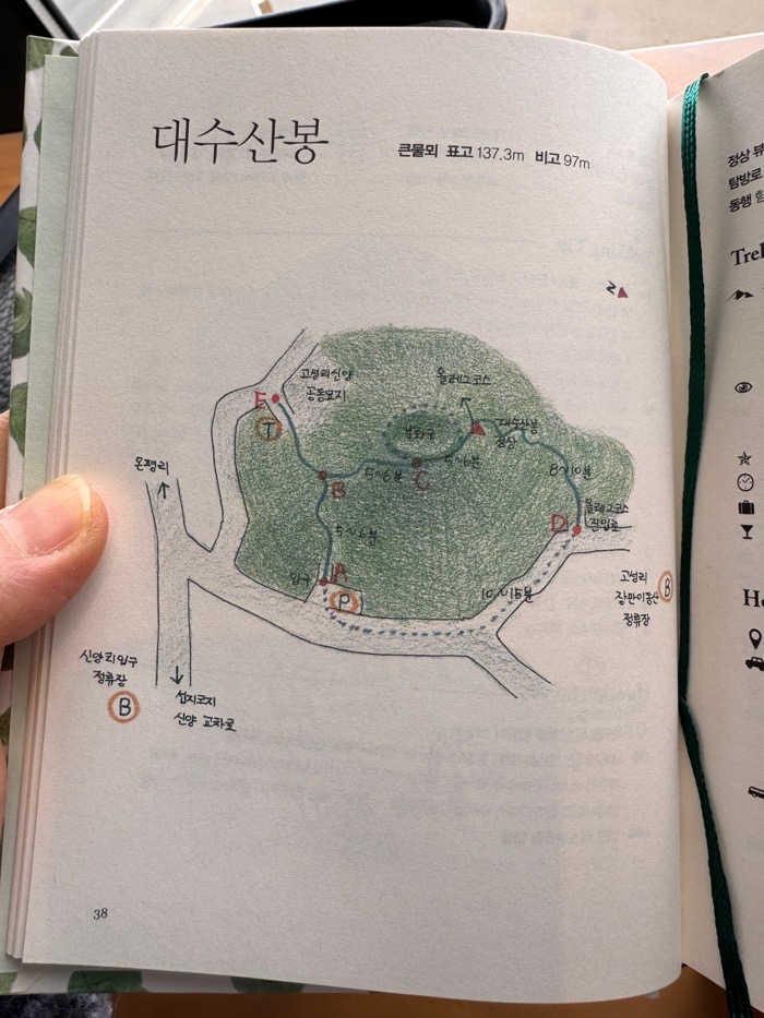 계획을 세워보자. 광치기해변부터 온평포구까지 이어지는 올레길 3번 코스엔 총 세 군데의 스탬프 지점이 있었다. 시작점인 광치기해변, 중간지점인 대수산봉 정상, 종점인 온평포구라고 한다. 그럼 셋 중에 가장 가기 어려운 곳이 당연히 대수산봉 정상이겠지? 오케이, 나의 첫 도장을 쉽게 찍을 수는 없다! 이렇게 된 거, 대수산봉이란 곳을 올라가보기로 2초만에 마음을 먹는다. 소중한 나의 오름백과를 꺼내 대수산봉을 찾아보니 안내가 있었다.
