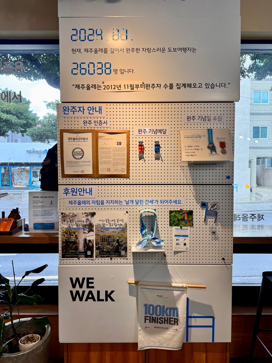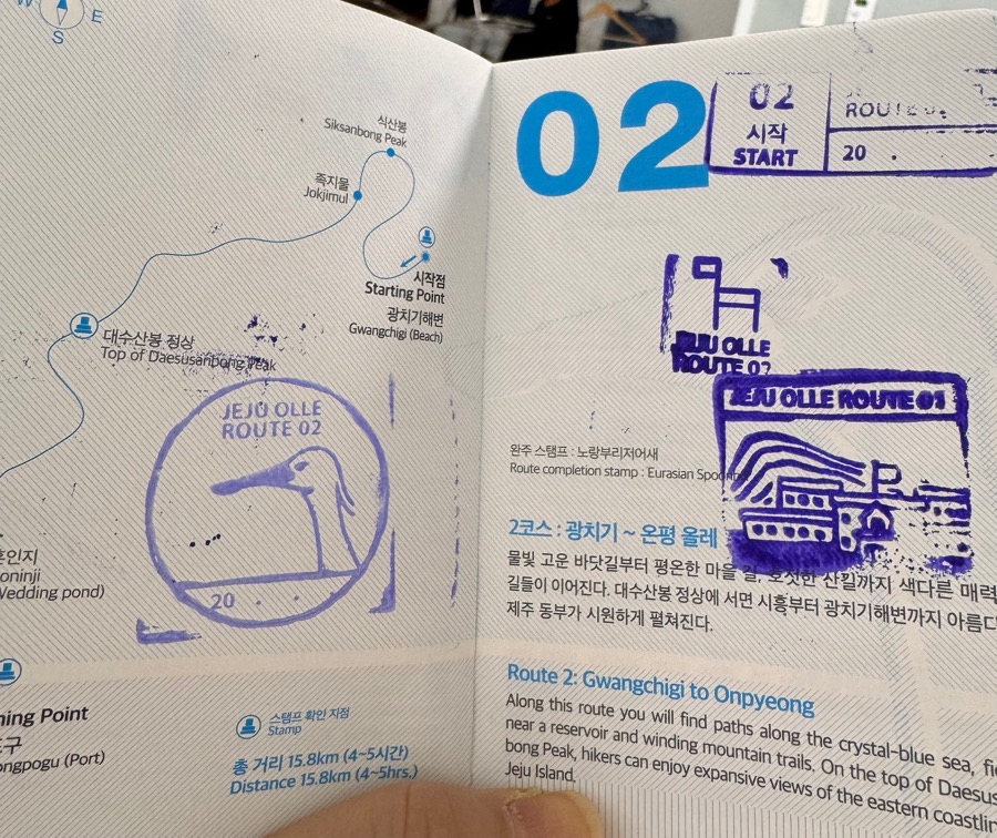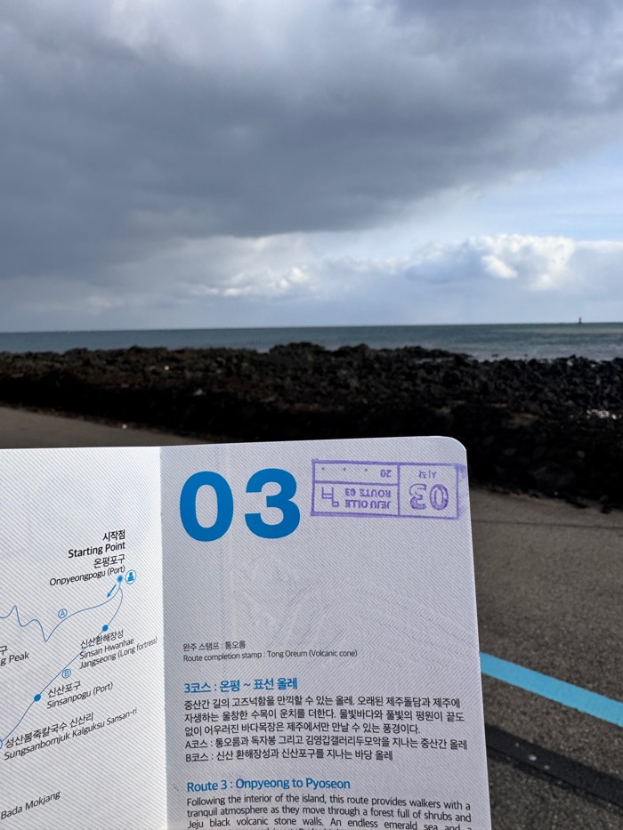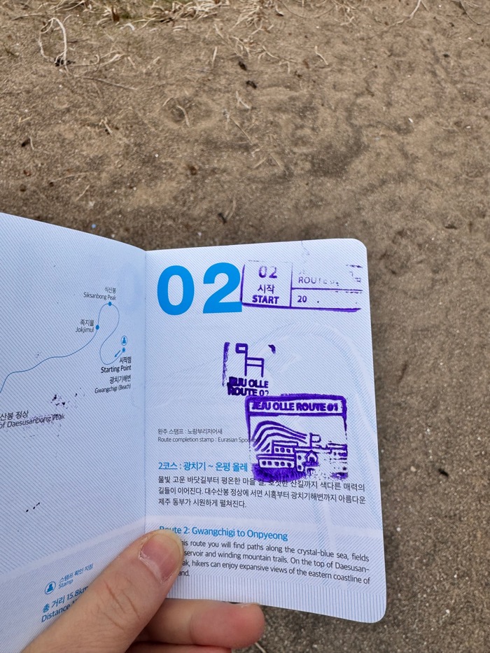 거꾸로 찍었다. 정말 가지가지 하는 나. 그 와중에 너무 잘찍혀서 더 슬퍼. 그러니까 올레 여권 도장 페이지는 숫자 옆에 시작 도장, 왼쪽에 조그맣게 중간 도장, 그리고 오른쪽 큰 여백에 완주 도장을 찍으면 완벽하겠구나. 라는 걸 깨달았다.