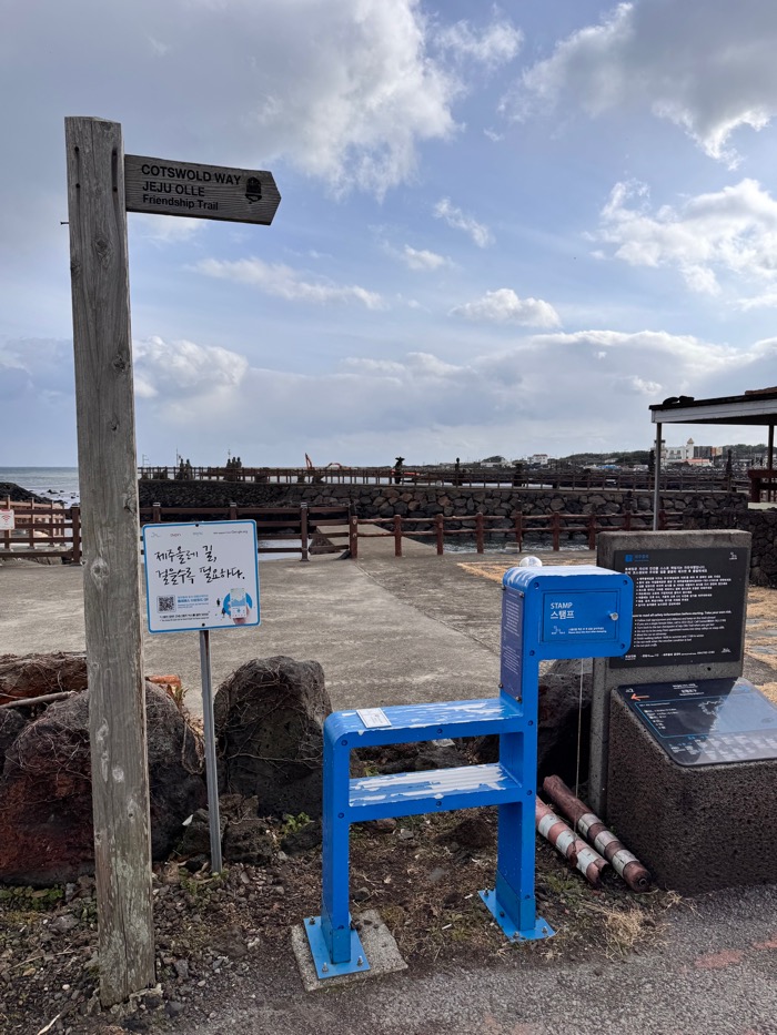 스탬프함의 뚜껑을 열었는데 도장이 두 개나 들어있었다. 아, 올레길을 거꾸로 도는 사람도 있다더니 시점과 종점 도장이 같이 있나보네? 개이득.. 여기서 다 찍어야지! 하고 신나게 빠박! 찍었는데. 뎀. 여긴 ‘1번 코스 종점’이며 ‘2번 코스 시점’이었다. 그러니까 종점 도장은 1번 페이지에 찍었어야했…..
