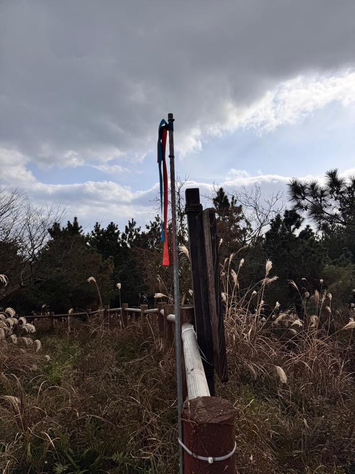 중간에 갈림길을 하나 지나왔는데 대체 저 길은 어디로 가는 길이길래 오르막이래? 생각만 했는데 거기가 정상가는 길이었다. 흠냥 지나온 길을 돌아 다시 정상으로. 갑자기 눈발까지 날리고 길 양옆은 모두 공동묘지였다. 조상님도 함께하는 올레길투어..
