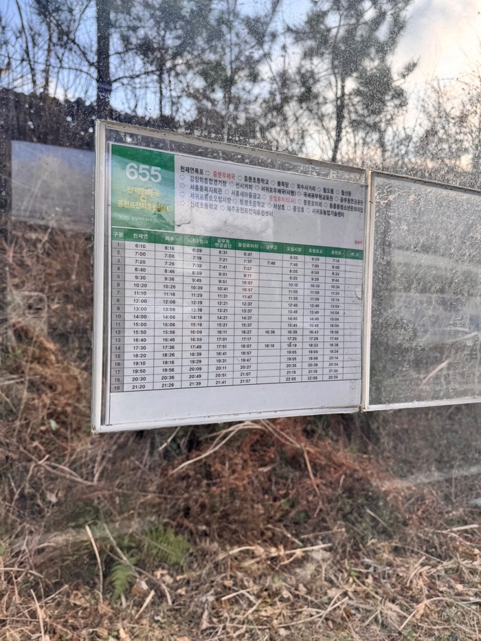 그렇다면 방법이 없지. 일요일에 나가는 배가 있나, 차량 선적 가능한가 확인하고, 숙소에 전화를 걸어 일요일 아침 체크아웃이 가능한지 확인한다. 숙소도 배편도 모두 문제없음을 확인한 뒤에야 수억 깨진 수리비가 떠올랐지만 모르겠다 이미 벌어진 일. 제주에 오지 않았더라도 고장날 차는 고장이 났을 일이다. 제주에 와서 돈이 좀 더 들었다면 그것도 어쩔 수 없지. 속편히 차를 맡기고, 수리비에 수억이 든 기념으로 택시 대신 버스를 타기로 한다. 가까운 버스정류장에 와서 배차표를 보는데 다음 차가 무려 45분 뒤에 있네? (제주도의 노선 중 상당수는 지도 앱에서 실시간 정보 제공이 안 됨..)