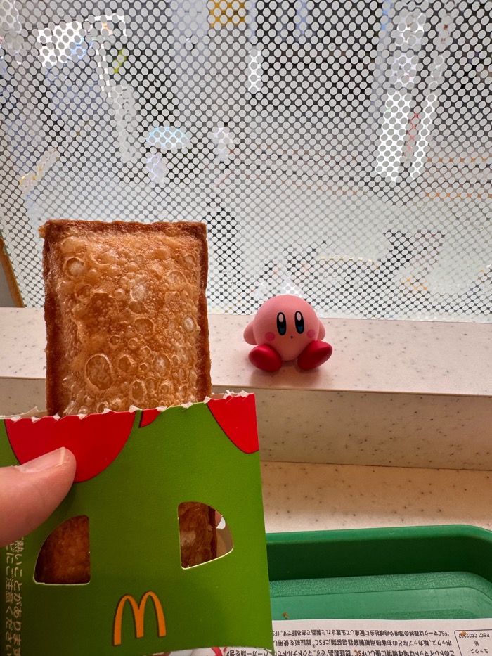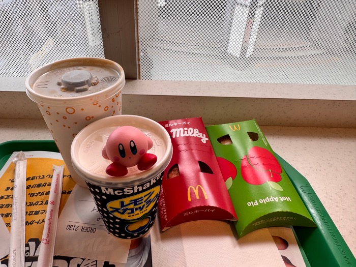 Osaka 7끼. 걷다가 그냥 들어온 맥다날. 우리나라에 없는 메뉴라기에 여행자의 의무감에 시켜본 애플파이와 우유파이. (w가챠에서 400엔 주고 뽑아온 커비)